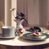The Francis Carreau Green Porcelain Tea Cup Extra with Saucer by Rosenthal is designed to elevate refined tea service. Part of the Francis Carreau collection, it features fresh green geometric check patterns delicately framed with fine gold contours, balanced by crisp white porcelain surfaces for a vibrant and sophisticated look.