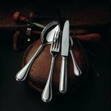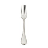 Französisch-Perl menu fork by Robbe & Berking is silver plated, with slender tines. Its form reflects the elegance of late Rococo and the clarity of early French Neoclassicism, enhanced by the distinctive beaded handle. As part of the Französisch-Perl collection, this fork expresses a historic Parisian pattern in a versatile dining piece.