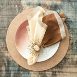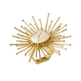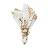 Every spoke of this gold napkin ring is meticulously welded and bent to create its unique shape.  Finished in gold metallic paint, with a white quartz centerpiece, it brings a sophisticated presence to the table.