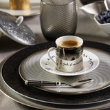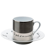 The Coffee Cup Platinum Mirror & Saucer Le Gabier de Vigie from the Jean Cocteau collection by Raynaud unites artistic heritage with refined porcelain craftsmanship. The cup is lacquered with a platinum mirror finish, reflecting light with striking brilliance. Its accompanying saucer reveals an anamorphic quotation by Jean Cocteau, written in reverse for poetic intrigue.