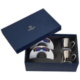 The Anamorphoses espresso set box consists of two Platine espresso cups and two Papillon Bleu (Blue Butterfly) espresso saucers.
