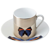 Set of 2 Espresso Cups Platinum Mirror and Saucers Blue Butterfly in a Gift Box