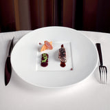 The Hommage presentation square center plate by Raynaud features the collection’s hallmark generously wide rim and layered design, crafted to inspire chefs and frame each creation with elegance. Its geometric form adds a modern touch to the timeless artistry of fine porcelain, making it perfect for striking table presentations.
