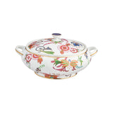 Adorned with hand-painted floral and botanical motifs in deep orange, cobalt blue, iron red, and green, the piece echoes the natural richness found in classic Imari porcelains from Japan's Kyūshū island. A fine gold trim highlights the rim, handles, and lid, adding an extra layer of sophistication to the design.