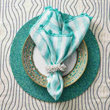 The Confetti Beaded Placemat in Turquoise by Kim Seybert brings vibrant sophistication to refined table settings. Handcrafted from thousands of precision-placed glass beads, this placemat features a rich turquoise base subtly blended with lighter aqua and soft green tones, creating a dynamic, confetti-like effect with depth and movement.