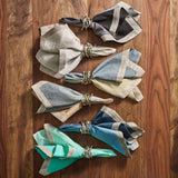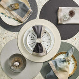 A striking ombre gradation in grey and black, gives depth and elegance to this refined linen napkin. Hand-dipped and dyed, each napkin is finished with a metallic border that adds shimmer. The dramatic yet versatile color palette pairs beautifully with festive table settings, making it a standout choice for special occasions.