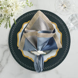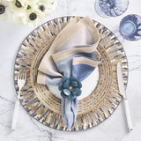 Crafted from linen, this napkin features a hand-dipped ombré transition from soft blue to glacial gray. The gradual color shift creates a calm visual flow across the fabric, defined further by a metallic foil border that outlines the edge with precision. Each piece reflects slight variation from the dyeing process, reinforcing its artisanal character. Suitable for year-round table styling, the composition balances tonal depth with a composed decorative presence across both casual and formal settings.