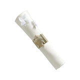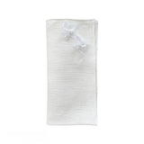 White linen napkin featuring rolled edges and subtle tone-on-tone floral appliqué. Crafted in Italy with natural fibers.