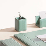 The Monogram Pen Holder adds a touch of sophistication to your desk. Featuring padded leather inserts and the iconic Elie Saab Monogram pattern, it offers a stylish and functional way to organize your pens and office supplies. This elegant accessory elevates your workspace while keeping it neat and organized. Perfect for adding luxury to your professional environment.