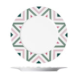 The Paraiso Porcelain Dinner Plate with Rim by Sieger by Fürstenberg combines bold artistry with fine porcelain craftsmanship. Part of the Paraiso collection, it is decorated with vibrant geometric patterns and tropical-inspired motifs in fresh shades of green, pink, and white, arranged in a dynamic chevron design that brings playful elegance to the table.