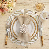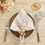 This placemat in white showcases hand-cut bamboo slats meticulously arranged in a captivating geometric pattern. Each bamboo slat is carefully positioned by hand, resulting in a harmonious fusion of sleek, refined lines and authentic organic elements.