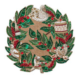 Christmas Carol Placemat sets the table for joyful gatherings. Inspired by the classic holiday song, this ode to festive ornamentation brings merry motifs to parties and gatherings around Christmastime. In the classic holiday colors of red, green and gold, the placemat is crafted with over 25 types of beads.