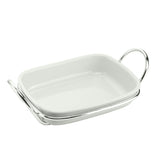 The porcelain insert is ovenproof and removable, ensuring practicality for both preparation and serving. The silver-plated holder provides a refined contrast to the porcelain, combining durability with visual sophistication. Designed with ergonomic handles, it allows effortless transport from kitchen to table while maintaining a polished aesthetic.