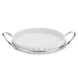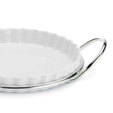 The Porcelain Round Tart Tray on Silver-Plated Stand Grand Gourmet by Greggio unites refined design with practical versatility. Expertly crafted for both presentation and performance, this porcelain oven dish allows you to effortlessly prepare, bake, and serve hot tarts, quiches, or pies with elegance.