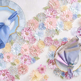 Adorned with delicate hand-layered and folded embellishments, the Dahlia Table Runner transforms into an exquisite centrepiece. Inspired by the vibrant hues of summer dahlias, this runner showcases a mesmerising interplay of pink, blue, and yellow pastels. Each bead meticulously placed to mimic the intricate petals of the namesake flower, breathing life and dimension onto the table's surface.