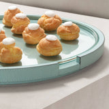 The Gourmet Round Serving Tray in Sky Blue by Giobagnara is a refined expression of Italian artistry and contemporary design. Handcrafted in Italy, this elegant tray features a solid wood base entirely covered in printed calfskin leather, known for its fine texture and luxurious appearance. The removable glass top adds functionality and a touch of modern elegance, making it ideal for both serving and decorative use.