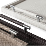 The Dedalo Square Woven Leather Tray with Handles in Cream by Pinetti showcases the brand’s signature craftsmanship and contemporary elegance. Handmade in Italy, this refined piece features a structured wooden base wrapped in luxurious woven leather, paired with polished chrome handles for a sleek modern touch.