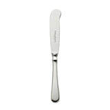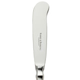 Silver-plated butter knife, part of the Spaten collection. It features an elongated handle with a straight profile that widens toward the base, creating stable balance and a geometric silhouette. The upper section transitions into a sculpted detail shaped by hand, a design element rooted in early 18th-century silverwork.