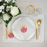 These placemats are made from Italian beige cotton. Each one is embroidered with a Christmas bauble motif in viscose thread and finished with a stitched gold border. Designed in a rectangular form and presented as a set of six, they bring festive detail to the holiday table with a simple and elegant style.