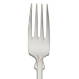 Silver-plated dessert fork, part of the Spaten collection. It features an elongated handle with a straight profile that widens toward the base, creating stable balance and a geometric silhouette. The upper section transitions into a sculpted detail shaped by hand, a design element rooted in early 18th-century silverwork.