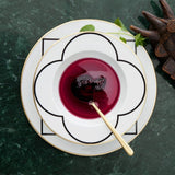 The MY CHINA! Ca’ D’Oro Dinner Plate with Rim by SIEGER for FÜRSTENBERG captures the collection’s signature blend of minimalist precision and luxurious detailing. Crafted from the finest porcelain, the plate features a striking black square border framed with a delicate band of burnished gold, creating a harmonious balance of geometry and elegance.