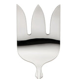 Silver-plated fish serving fork, part of the Spaten collection. It features an elongated handle with a straight profile that widens toward the base, creating stable balance and a geometric silhouette. The upper section transitions into a sculpted detail shaped by hand, a design element rooted in early 18th-century silverwork.