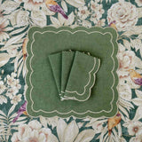 Made of Italian cotton fabric in a olive green hue and embroidered with ecru viscose thread, these napkins feature a wave-shaped border. Each one is hand-finished in Roseberry Home’s workshops in Poland.