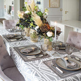 Hand-made from gray linen, these placemats are embroidered with a minimalist motif in light gray viscose thread. The rectangular pieces are carefully finished, offering a subtle and refined detail for the dining table.