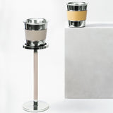 This insulated polished steel champagne bucket with a leather insert will give a fresh and modern look to any table setting, with high functionality and aesthetic performance. It is accompanied by a stainless steel stand with a heavy solid base and leather-covered central column.