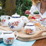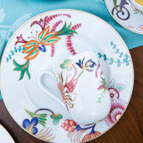 The mug is richly decorated with a harmonious blend of botanical and mineral-inspired motifs in cobalt blue, iron red, and vibrant green, finished with a golden rim and base detail. The interplay of geometric patterns and watercolour-style florals brings an exquisite balance of structure and fluidity.