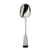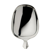 Silver-plated salad serving spoon small, part of the Spaten collection. It features an elongated handle with a straight profile that widens toward the base, creating stable balance and a geometric silhouette. The upper section transitions into a sculpted detail shaped by hand, a design element rooted in early 18th-century silverwork.