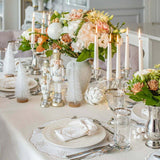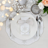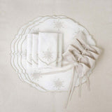 Shimmering silver embroidery forms delicate star motifs across soft round cotton, bringing festive elegance to seasonal tables. Part of the Shiny Silver Christmas collection, the Silver Stars placemats coordinate seamlessly with matching embroidered napkins and plush ivory velvet bows for a cohesive holiday setting.