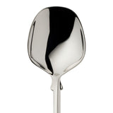 Silver-plated sugar spoon, part of the Spaten collection. It features an elongated handle with a straight profile that widens toward the base, creating stable balance and a geometric silhouette. The upper section transitions into a sculpted detail shaped by hand, a design element rooted in early 18th-century silverwork.