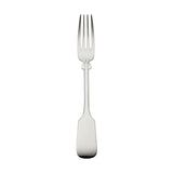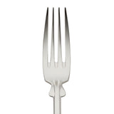 Silver-plated table fork, part of the Spaten collection. It features an elongated handle with a straight profile that widens toward the base, creating stable balance and a geometric silhouette. The upper section transitions into a sculpted detail shaped by hand, a design element rooted in early 18th-century silverwork.